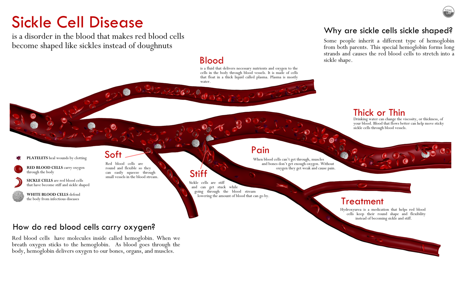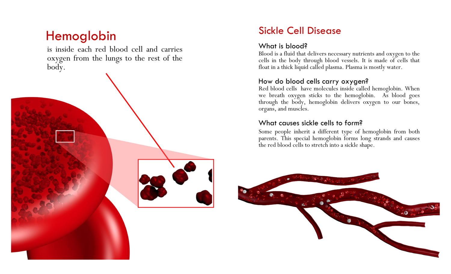 Following user studies, I decided to also generate a pamphlet specific to the Sickle Cell Station (Fig. \ref{fig:Pamphlet}). The pamphlet was designed to be large enough to children hold easily and contain an image on the cover to grab their attention. I used only images and text found in other parts of the station for consistency during testing and evaluations on learning. The text and images are taken directly from the screens of the tablet application and information poster. The pamphlet is printed on two sides of a heavy 11x14 inch paper and folded in half. The cover of the pamphlet shows the large blood vessel and three main points on sickle cell disease. the open layout of the pamphlet is a replica of the poster. The final back page show the Hemoglobin image from the tablet application which zooms in and defines hemoglobin.