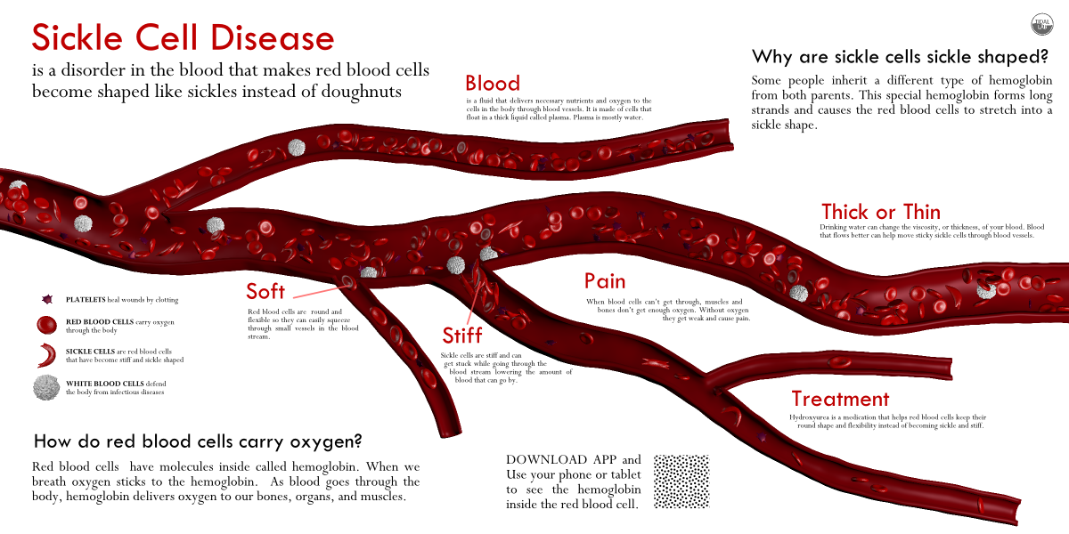This poster contains text descriptions of sickle cell disease, the effects on the red blood cells and their hemoglobin, and short detail on treatments. It should be noted that this information is not described in either of the tablet applications.